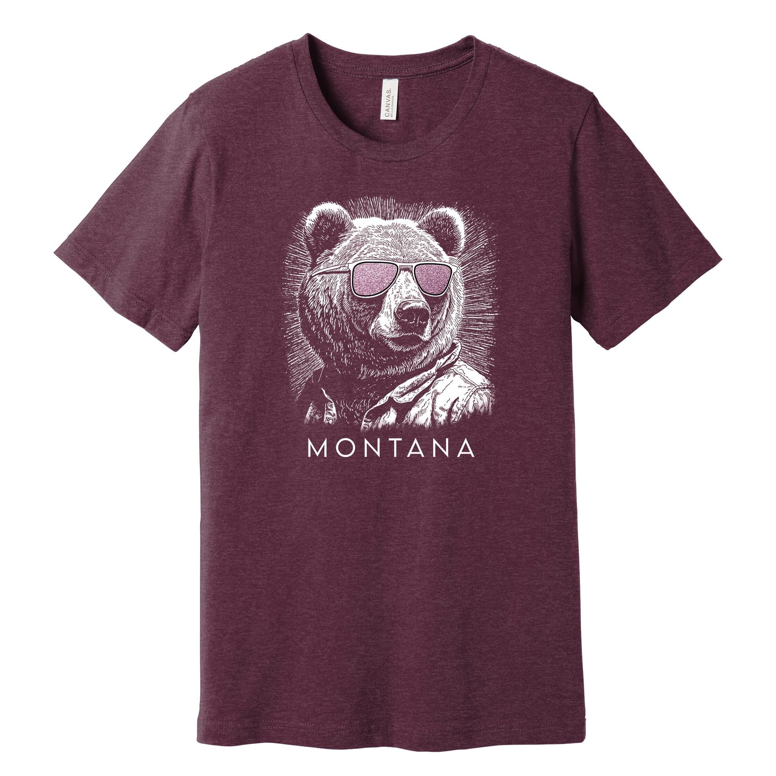 This tri-blend tshirt is made from a soft and comfortable material, perfect for any casual occasion. It features a unique screen print of a bear wearing sunglasses, surrounded by scenic mountains and sun-ray like lines, all in the shape of the state of Montana. The screen print was done with care and precision in Missoula, Montana, ensuring a high-quality and locally made product.
