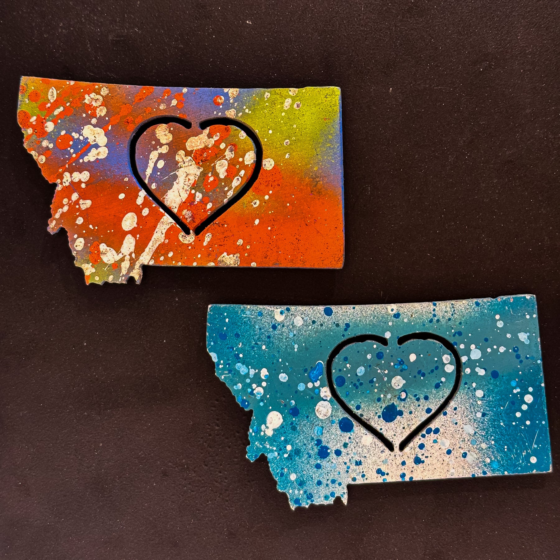 Love your space with this Montana heart swirl magnet! This playful magnet brings a splash of artistic charm to any room. A cut-out Montana state shape with a heart embedded in it and a strong back magnet showcases a love of Montana. This is a handmade and variable color item, a splash and spray of paint showcases a variety of colorways. When you purchase this you could receive one of many fun colors.